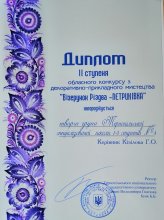 Чудова ідея із грудневими заметілями прилетіла до нас від невтомних викладачок інституту мистецтв ТНПУ – створити новорічну прикрасу у стилі петриківського розпису. Обласний конкурс декоративно – прикладного мистецтва «Україна – це я» за темою «Візерунок Різдва – ПЕТРИКІВКА» проводився для учнів старших класів і передбачав командну роботу. Честь нашої школи захищали неймовірні учні - Семенець Валерія (10-А клас), Магула Сергій (9-В клас), Кузик Вероніка, Тарвід Кароліна та Об’єщик Андріана (8-В клас). Чудові роботи, що могли би стати окрасою будь – якої оселі, прикрашають зараз ялинку у вестибюлі інституту мистецтв. А ми вітаємо команду школи з дипломом другого ступеню у цьому конкурсі!