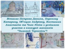 Напружена атмосфера в суспільстві сприяє пошуку шляхів гармонізації та рівноваги. І що як не мистецтво покликане приносити радість і позитивні емоції! Конкурс малюнків "Зимовий Тернопіль" приніс приємні новини для учнів нашої школи: Тютюнник Катерина - гран-прі, Петров Данило – 3 місце (у середній віковій категоріЇ), Костишин Анастасія – 3 місце та Паронова Катерина – 2 місце (у старшій віковій категорії). Андріана Об'єщик визнана однією з кращих в номінації «Креативне мистецьке бачення». А члени гуртка образотворчого мистецтва "Палітра" побували на виставці гіперреалістичних портретів молодої тернопільської художниці Христини Боднарук в художньому музеї. Вражаюча експозиція принесла багато цікавого та повчального матеріалу для майбутніх майстрів пензля!